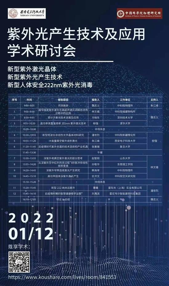 我国在新型紫外激光晶体、新型紫外光产生和新型人体安全222nm紫外光消毒等紫外光相关的领域具有世界领先的科技,不少成果也实现了转化应用。为了进一步探讨并挖掘紫外光产生技术及在灭菌杀毒、疫情防护等方面的应用,2022年1月12日,PA视讯官方网站联合中科院物理所举办“紫外光产生技术及应用研讨会”。研讨会针对紫外光的产生、紫外激光晶体技术以及紫外激光在消毒杀菌和智慧健康等领域的应用,邀请国内多个科研院所和科技企业进行交流讨论。星际光(上海)实业有限公司作为新型紫外光运用领域的领先企业,已将222纳米紫外光用于新冠消杀领域,作为嘉宾参加本次研讨会。