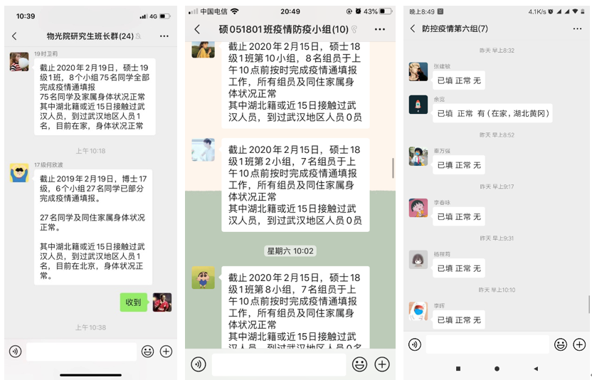 根据研究生现有组织结构,PA视讯建立了“公司—班级—班小组”的三级防控管理体系。公司层面由公司防控组主管领导统筹安排,研究生导师、研究生辅导员、研究生兼职辅导员具体实施,要求各负责人及时汇总分析疫情数据、向上反馈防控信息、处理各项突发事件。班级层面由支委、班委成员组成班级防控工作组,全面掌握班级各人情况,汇总各工作小组每日上报信息,排查、关注并跟踪“身处疫区、身体异恙、数据异常”情况。班内根据实际情况,以同宿舍、同实验室、同地区等方式灵活划分防控工作小组,每组设组长一名,保证各项通知落实、各类数据如实、各人填报及时,实现研究生疫情防控工作“人盯人”要求。