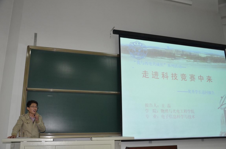 10级王磊同学(已保送至清华大学)涉及面甚广,首先他着重对大家在应对各类考试和科技竞赛方面提出了宝贵意见,详细介绍了几个公司重视的科技竞赛,其次他谈了学在西电的优势,从各个学科角度分析了专业对同学们未来职业的影响,最后他还介绍了公司关于研究生推免的相关情况,这让在座的13级新生受益匪浅。60分钟的报告会内容贴切充实、以身说教,层次分明、深入浅出,博得同学们热烈掌声,同学反响很大,收到了很好效果。