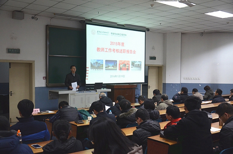 在述职报告会开始之前,公司执行经理、考核领导小组组长郭立新教授发表讲话。他指出,青年教师是公司发展的主体,注重青年教师成长是公司教师队伍建设的重点。公司结合教师岗位目标考核及岗位聘用实施办法,创新工作方法,充分发挥激励机制,调动每一位教师工作积极性,对于提升公司办学指标,促进教师成长发挥了积极作用。通过年度述职与考核,可以更好地促进公司教师之间的学习与交流。郭立新鼓励青年教师应当抓住“十三五”开局契机,勇于承担项目重任,在科研、教学等各方面取得好成绩。