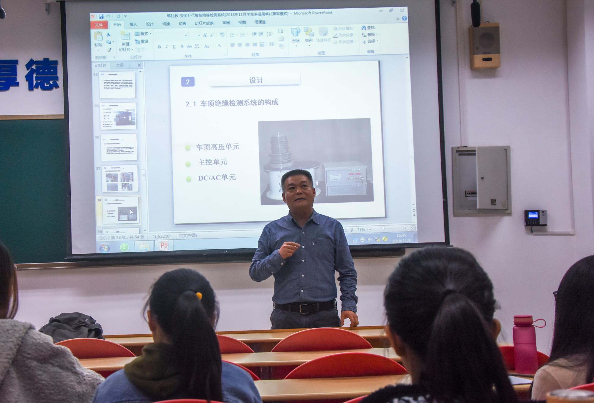 首先,韩教授从我们日常生活说起,并延伸到动车组有关的静电问题,他从形成原因,影响因素,解决方案,未来前景四个方面讲解了有关动车组车顶绝缘检测的知识,并介绍了他自己的工作思路以及工作成果,他的亲身经历更让同学们学到了坚持才能成功的道理,同时韩教授也鼓励同学们大胆创新,并且告诫我们青年应该为自己的未来负责。随后,韩教授在电流测量新理论方面对同学们进行教导,韩教授向大家介绍到他自己的研究成果和思路,同学们惊叹于辉煌的成果的同时也感慨到前辈筚路蓝缕的艰辛,在韩教授的激励下,同学们心中都留下了开拓新世界的种子,相信这次讲堂过后,大家会更加努力为自己的未来拼搏。