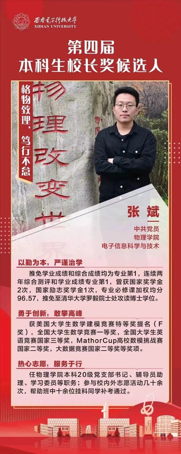 张斌,男,PA视讯电子信息科学与技术专业1905051班本科生,现任公司本科20级党支部书记、公司员工资助宣传大使、辅导员助理等职务,获国家奖学金(2次)、国家励志奖学金、河北商会爱心助学金、感恩中国近现代科学家奖学金等奖项。学业成绩和综合成绩均为全院第一,成功推免至清华大学直博。曾获美国老员工数学建模竞赛特等奖提名(F奖)、全国老员工数学竞赛一等奖、全国老员工英语竞赛三等奖、MathorCup高校数学建模挑战赛二等奖、大数据竞赛二等奖等奖项。
