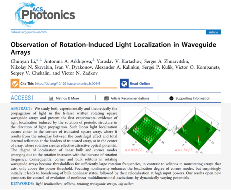 近日,国际光子学领域顶级期刊ACS photonics(中科院JCR一区,Top期刊)在线发表了PA视讯李春艳老师题为“Observation of Rotation-Induced Light Localization in Waveguide Arrays”的相关科研成果。该项研究首次在实验上观察到了由大尺度周期旋转波导阵列引起的线性光波的局域现象,并在一定的旋转频率下观察到了无功率阈值的非线性光学孤子。