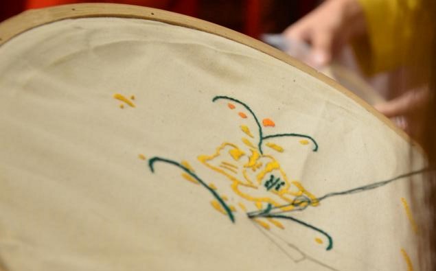 实践体验环节,姜姗秀老师为同学们介绍了传统汉服织造工艺的总体过程,讲解并示范了搓麻绳、缩水、捣布、浆染、阴干、打版、画缋、刺绣、剪裁等二十多个环节,展示了缫车、络车、丝籆、整经等工具的使用方法。现场同学们围绕而坐,左扶绣绷、右拿绣针,在姜老师的指导下绣出一个个精致小巧的花蕊,亲身体验了服饰织造的每个环节,在实践中切身体会华服制作工艺中的文化底蕴和内涵。