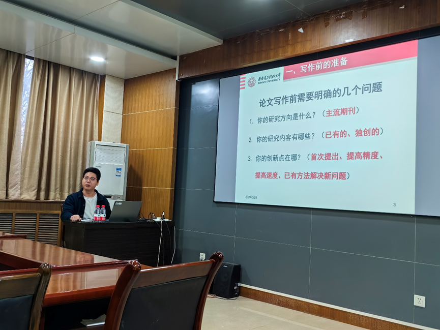 李金录向大家介绍了论文写作的相关注意事项。他指出,创新点是学术论文最重要的部分,创新点的提出一般是基于已有的方法做提高,所以要熟练掌握课题组现有的成熟方法、国内国际的流行方法,才能在此基础上思考自己的创新点;他强调,学术论文的各部分应紧密配合,发挥各自作用:论文题目要简洁而有新意,充分凝练论文主题;摘要不宜过长,应简洁阐明论文的研究方法并写出简要结论;引言应全面准确地回顾前人的相关工作,提出论文的研究问题,阐明解决思路;论述论文主要研究内容时,应详明确每个步骤、每个公式的含义,不得出现歧义,分析结果时要通过实例凸显文中方法的成效。