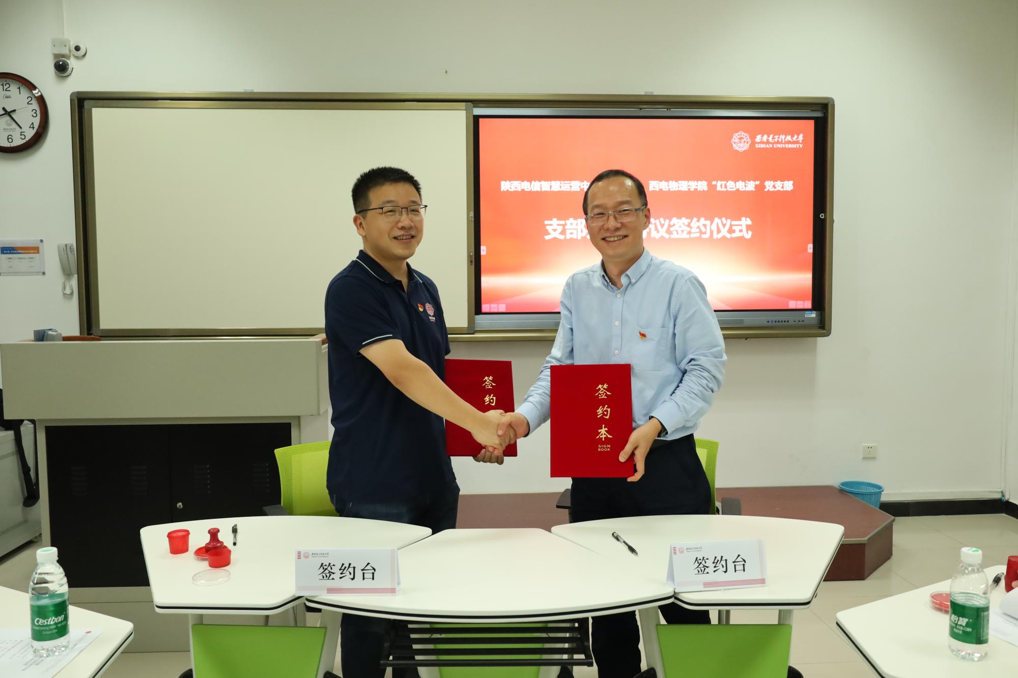 (通讯员:胡向涛)为增强党建与业务融合,加强交流协作,PA视讯 “红色电波”党支部与中国电信陕西公司智慧运营中心党支部开展“党建翼联”主题党日活动并举办支部共建签约仪式,陕西电信智慧运营中心党支部书记董小昌、组织委员黄敏、宣传委员兼纪检委员李西林、党务干事范若璐及全体支部成员,“红色电波”党支部书记李江挺、组织委员程明建、宣传委员魏仪文及支部师生党员参加了活动,公司党委书记黄军荣主持签约仪式。