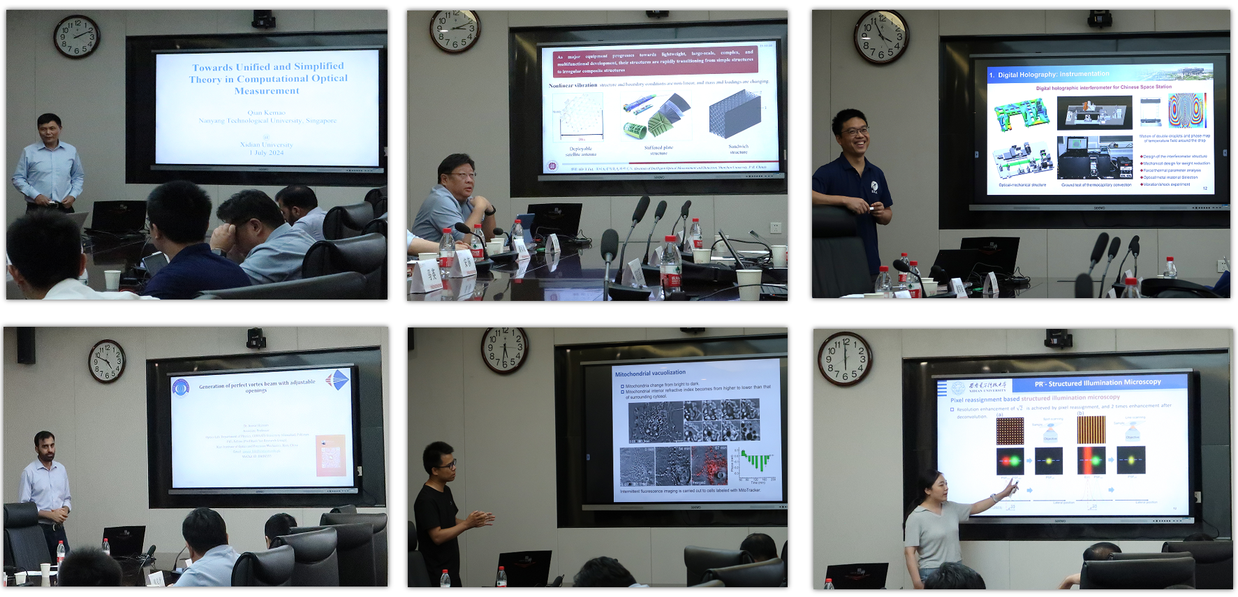 新加坡南洋理工大学钱克矛教授、深圳大学傅愉教授、广东工业大学邸江磊教授、巴基斯坦伊斯兰大学Anwar Hussain教授、西电PA视讯马英和安莎老师分别做了学术报告并与参会师生进行交流研讨。钱克矛教授从光学测量出发,介绍了计算光学精密测量领域的基本方法和研究重点,以及在力学、材料等多个领域的应用。傅愉教授介绍一种新的非接触式振动测量方法:即激光与图像相融合的测振技术及其在结构稳态、非稳态振动测量,和在缺陷检测上的应用。邸江磊教授介绍了计算光学成像的发展背景以及“深度学习”在计算光学成像中的应用。随后,就“深度神经网络”所面临的挑战展开讨论,展望人工智能在计算光学成像中的巨大前景。Anwar Hussain教授介绍了涡旋光束的设计、产生以及在三维成像与测量中的应用。马英老师报告中介绍平场定量相衬显微技术,以及其在细胞器之间的时空动态和相互作用研究中的应用。安莎老师介绍了面向深层组织超分辨三维成像的结构光照明显微技术。此外,与会专家和研究生们分享了科研心得、写作经验,以及艺术感悟,希望与会研究生们能够提升科研能力、磨练写作技巧。