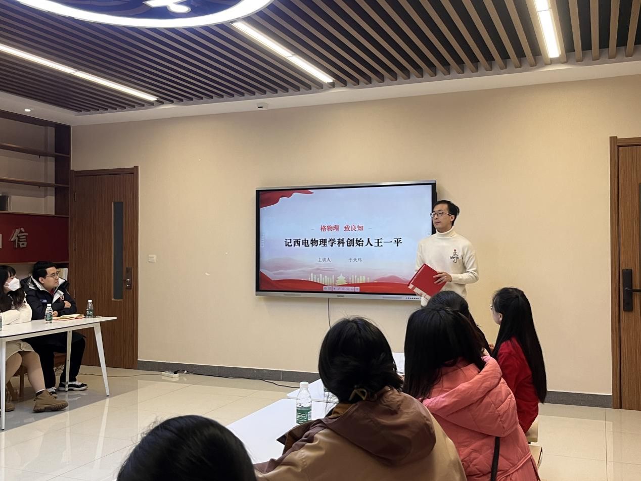 PA视讯硕士2023级党支部书记于天玮作了《格物理致良知——记西电物理学科创始人王一平》主题宣讲,讲述了西电物理学科创始人王一平的传奇故事,包括武汉大学地下党的革命经历、创办物理学科、物理团队班人才培养等,回顾了王一平教授一生的奋斗历程和革命、教育贡献,勉励同学们传承红色血脉,赓续科学家精神,为新时代物理学科和基础科学发展作出自己的贡献。