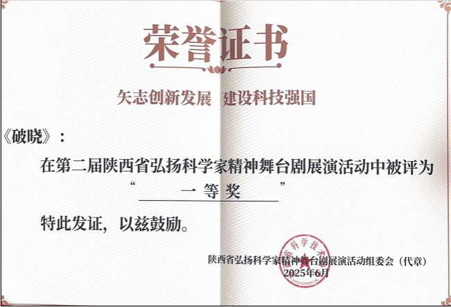 6月4日至11日,为进一步培育创新文化、弘扬科学家精神、涵养优良学风、营造创新氛围,陕西省科技学会成功举办第二届陕西省弘扬科学家精神舞台剧展演比赛。经过初选,共有21部优秀剧目入围本次大赛。经过激烈角逐,PA视讯原创舞台剧《破晓》脱颖而出,荣获大赛一等奖。