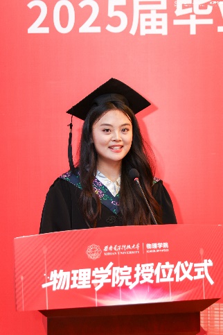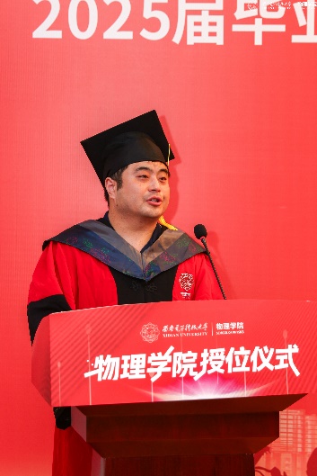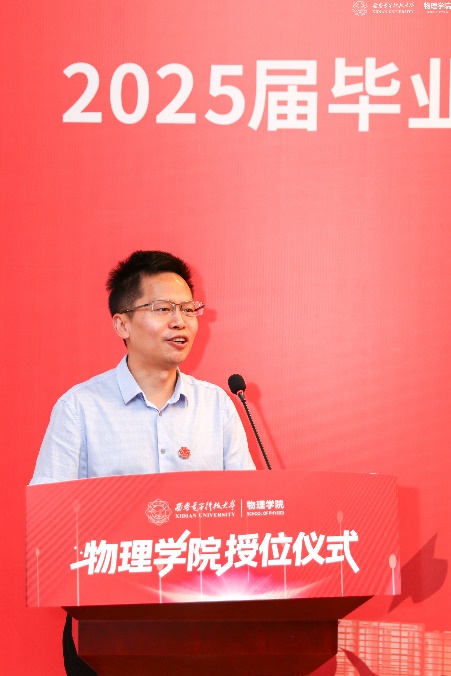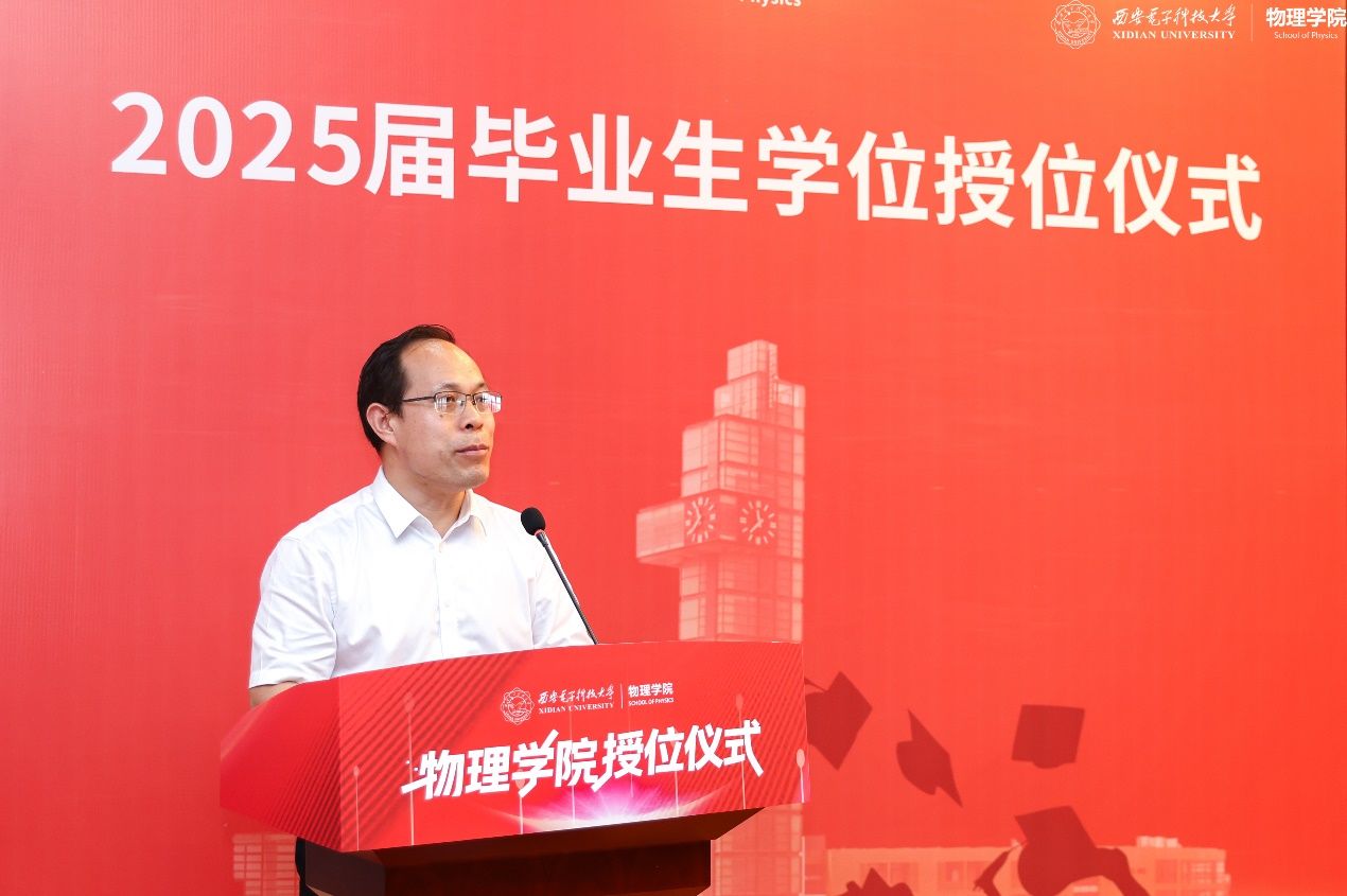 教师代表左炎春寄语同学们,希望同学们无论是投身科研,攻克“卡脖子”难题,还是扎根行业,推动技术创新,都能成为那个敢于突破边界、引领变革的“开拓者”。导师代表李春艳代表老师们真诚祝贺同学们顺利完成学业,同时希望同学们能够继续带着西电赋予的勇气与智慧,在更广阔的天地间:“以信息之刃,解物质之谜;用物理之眼,观天下之势。”