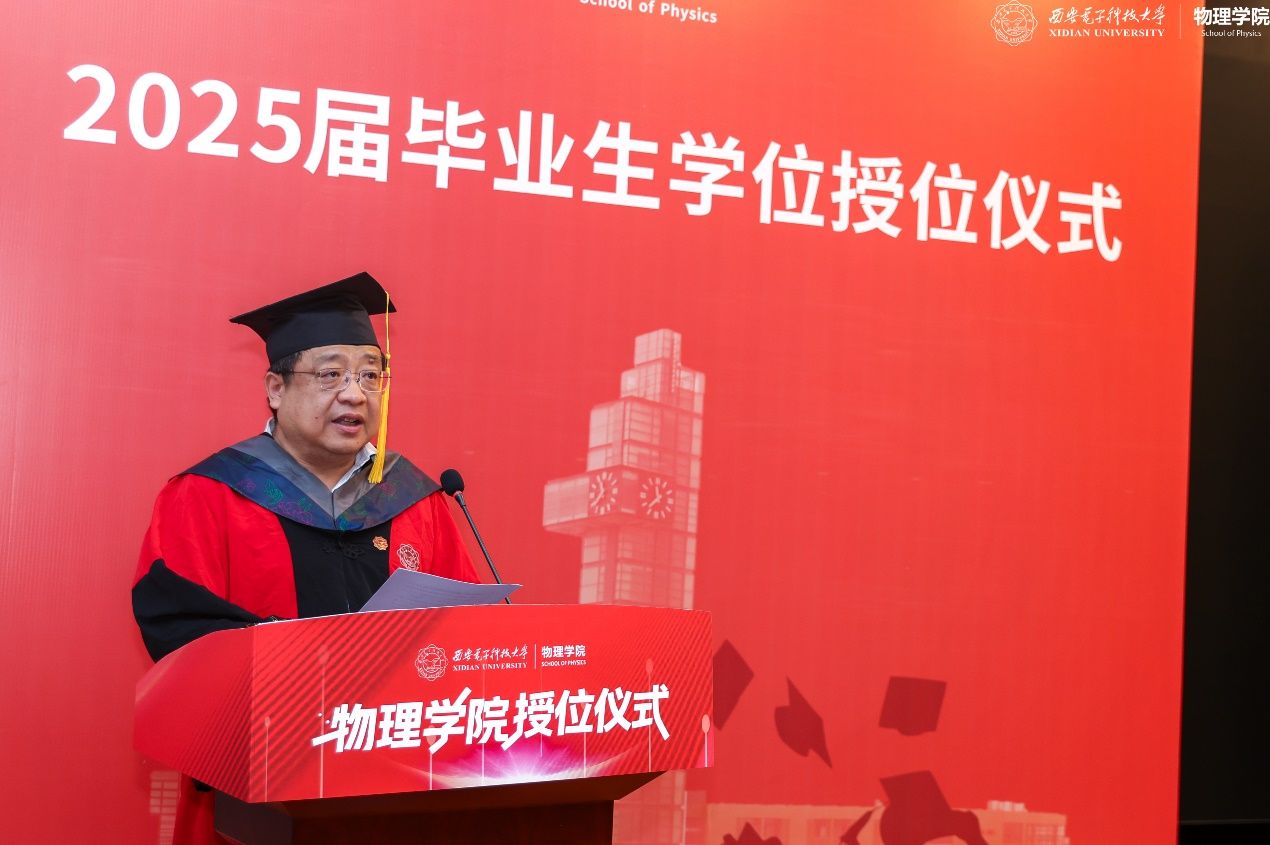 学位评定委员会主席郭立新教授宣读授位决定,他嘱咐毕业生要运用通过物理的学习和教育拥有的逻辑思考、解决问题的能力;跟随西电的红色基因和家国情怀的指引一路奋勇前行。希望大家谨记新时代西军电人的责任和使命,发扬PA视讯“信息物理、理工交融”的办学特色,坚守初心、勇攀高峰。