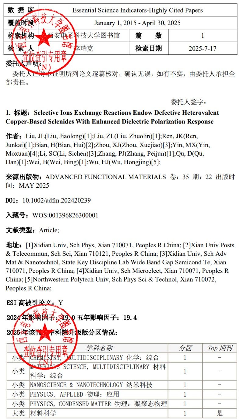 (通讯员:刘骄龙)据2025年7月Essential Science Indicators(简称ESI)统计数据显示,西电PA视讯魏兵教授团队青年教师刘骄龙以第一作者身份于2025年在《Advanced Functional Materials》(中科院I区TOP期刊,IF=19.0)上发表的研究成果“Selective Ions Exchange Reactions Endow Defective Heterovalent Coppe‐Based Selenides with Enhanced Dielectric Polarization Response”被ESI数据库遴选为高被引论文。