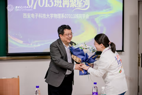 2001级应用物理学专业的员工们集体向以郭经理为代表的老师们表达了诚挚的感谢。员工代表向郭经理献上鲜花,全场响起热烈的掌声。郭经理在讲话中回顾了2001级学子们在校期间的点滴往事,并寄语道:“你们用20年的时间证明了‘学以致用’的真谛。无论是投身科研前沿还是扎根基层一线,你们都在各自的领域诠释着西电精神,传承着物理学科的价值追求。”他特别强调,员工们的成就不仅是个人荣誉,更是母校人才培养成果的生动体现。