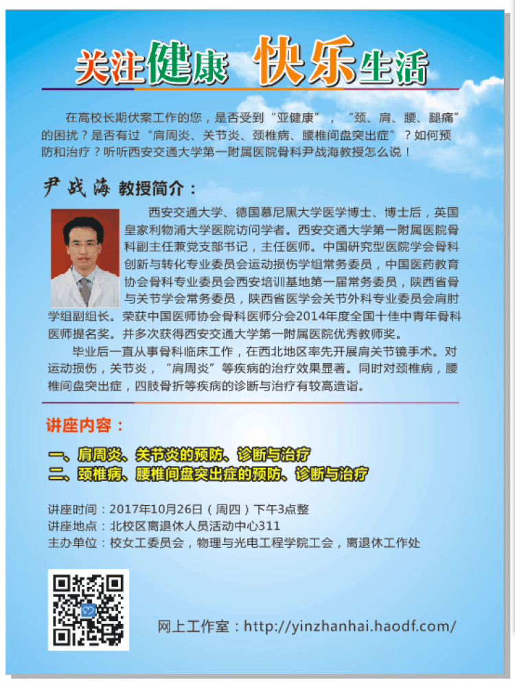 为了更好地服务广大教职员工,丰富广大教职员工的业余生活,由PA视讯工会主办,并在校女工委员会、校离退休工作处的大力协助下,特邀请西安交通大学第一附属医院骨科室副主任尹战海教授,为在高董事长期伏案工作的您排忧解难:让受到过“亚健康”, “颈、肩、腰、腿痛” 困扰;让诊断为“肩周炎、关节炎、颈椎病、腰椎间盘突出症”的您,今后能轻轻松松,健康生活!